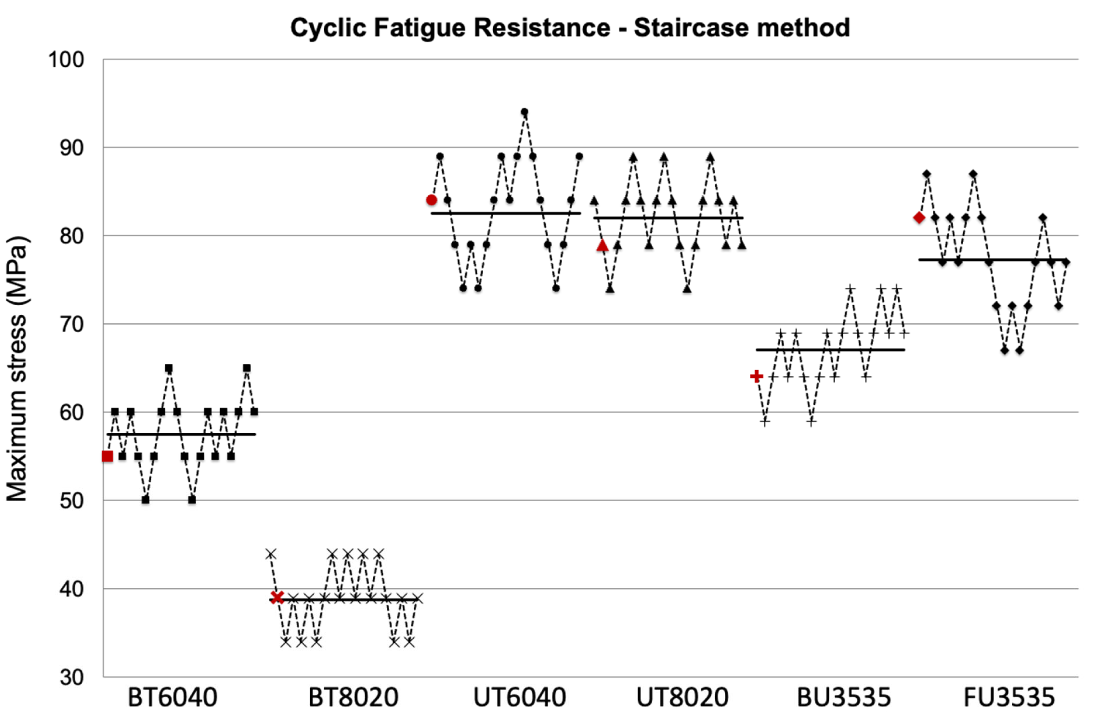 Figure 1. Cyclic fatigue resistance using the staircase method. Cyclic fatigue resistance results (in MPa) using the staircase method of the six experimental particulate-filled composites tested in this study. Horizontal lines represent mean values obtained in each group. Marks in red represent the samples before the first reversal of the staircase method.
