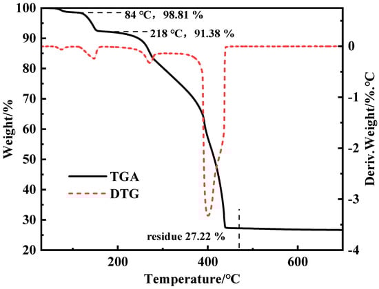 The thermogravimetric curve of ZnL was presented in Figure 2 using a thermogravimetric analyzer [34]. Based on the curve of ZnL, a mass loss of 1.19% at 84 °C was observed, which was due to the removal of free water from ZnL. A further mass loss of 7.43% was recorded for the sample at 218 °C, which was caused by the removal of crystalline water from ZnL. Meanwhile, the theoretical mass loss value for ZnL containing 5/2 crystalline water was calculated to be 7.64%, which was found to be very close to the actual value observed for ZnL. This indirectly verified the result of the above-mentioned elemental analysis involving 5/2 crystalline water. The molding temperature of PVC typically ranges from 160 to 220 °C, and it was found that the mass fraction of ZnL remained at 90% even at 245 °C. This indicated that ZnL was stable at the processing temperatures of PVC and met the basic requirements for being a PVC heat stabilizer. The mass fraction of ZnL stabilized at 27.22% and no longer decreased after heating at 540 °C, indicating that the thermal degradation of ZnL had been completed. The mass fraction of ZnL obtained from this result was basically consistent with that obtained from the crucible TG experiment (27.83%). It could, thus, be proven again that the molecular formula of the synthesized ZnL was Zn2(C10H9NO4)2·5/2H2O.