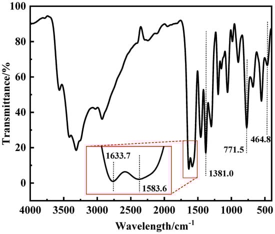 Figure 3 showed the infrared absorption spectra of ZnL, wherein certain characteristic absorption peaks provide important information regarding the structure of ZnL [35]. In the figure, an absorption peak observed at 1583.6 cm−1 was identified as the stretching vibration peak of the imine structure (C=N). Additionally, two absorption peaks, located at 1633.7 cm−1 and 1381.0 cm−1, were, respectively, due to the asymmetric and symmetrical stretching vibration peaks of the carboxylate structure (-COO-). At the same time, the peak detected at 771.5 cm−1 was regarded as the characteristic peak of the Zn-N structure. Its presence indicated the coordination between nitrogen and zinc atoms within the imine structure (C=N). Furthermore, after consulting relevant data, it was discovered that the peak at 464.8 cm−1 corresponded to the typical peak of the Zn-O bond. This finding suggested that oxygen atoms on the phenol group had combined with zinc atoms to form Zn-O bonds. When combined with the results from the aforementioned TGA and EA, the existence of these characteristic peaks confirmed that the ZnL had been successfully synthesized.