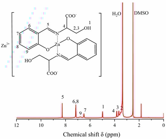 The 1H NMR spectrum of ZnL was shown in Figure 4. The 1H NMR spectrum of ZnL was recorded in DMSO-d6. The chemical shift δ = 2.51 corresponded to the characteristic peak of the solvent DMSO-d6, and the chemical shift δ = 3.34 corresponded to the characteristic peak of the H2O. From the 1H NMR spectrum of ZnL, the chemical shifts at 6.0~7.5 ppm (m, 6–9) corresponded to the four hydrogens on the ortho-substituted phenyl groups; the chemical shift δ = 8.27 (s, 5) corresponded to one hydrogen of the carbon-nitrogen double bond (HC=N); the shifts at 3.0~4.0 ppm (m, 2–4) corresponded to three hydrogens on the methylene (CH2) and methine (CH) groups; the chemical shift δ = 4.98 (s, 1) corresponded to 1 hydrogen of the hydroxyl group (OH). The above confirmed the synthesis of the final product ZnL.
