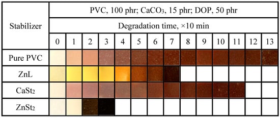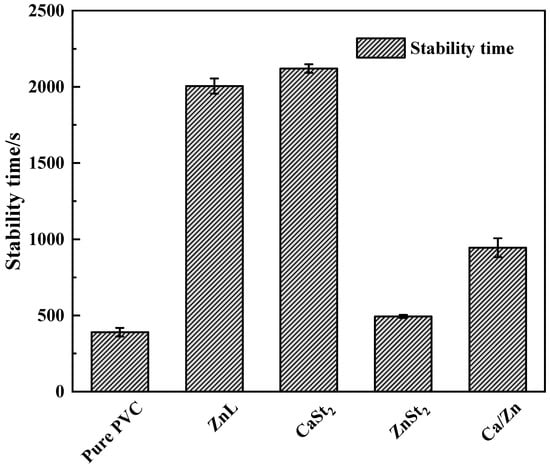 Results of the Static Congo red test on PVC stabilized with several heat stabilizers were displayed in Figure 5. As could be observed from the figure, the static Congo red time of PVC had been improved by the addition of several heat stabilizers [36]. The static Congo red time achieved with ZnL was found to be close to that of CaSt2, indicating good long-term heat resistance. This finding suggested that ZnL also exhibited superior HCl absorption capabilities and was more effective in restraining thermal decomposition of PVC.
