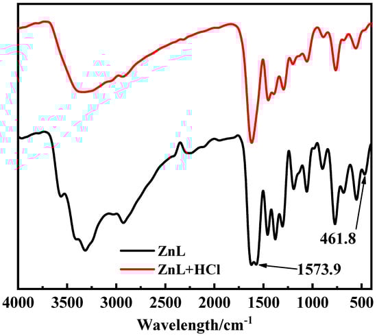 In the test conducted to verify whether ZnL could absorb HCl gas, it was observed that no white precipitate formed after adding AgNO3 into the filtrate of the control group, which had not been exposed to HCl gas. In contrast, a distinct white precipitate was detected in the filtrate of the experimental group, which had been exposed to HCl gas. This indicated that chloride ions were present in the filtrate of the experimental group, suggesting that ZnL had reacted with HCl. The Infrared spectrum of ZnL, both with and without HCl treatment, was shown in Figure 7. It was found that the peaks of HCl-treated ZnL at 1573.9 cm−1 and 461.8 cm−1 disappeared. The peak at 1573.9 cm−1, identified as the typical peak of the imine structure, demonstrated that the imine group might play a role in the absorption of HCl. Meanwhile, the peak at 461.8 cm−1, belonging to the representative peak of the Zn-O structure, suggested that the Zn-O bond in ZnL might have reacted with HCl.