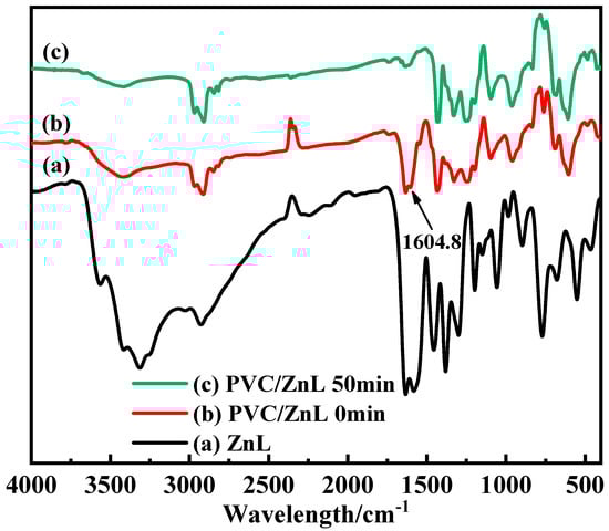 In the experiment conducted to verify whether ZnL could replace active chlorine on the PVC structure, the white precipitate was observed in the filtrate of the experimental group (PVC/ZnL) after AgNO3 was added. In contrast, no white precipitate was detected in the filtrate of the control group (pure PVC) after the addition of AgNO3, indicating that chloride ions were present in the filtrate of the experimental group. These results demonstrated that ZnL had reacted with the active chlorine on the PVC structure. Additionally, Figure 8 showed the FTIR of ZnL, PVC/ZnL, and heated PVC/ZnL. It was noted that the peak located at 1604.8 cm−1 in curve (b), representing PVC/ZnL, disappeared in curve (c) after heating treatment. This absorption peak was identified as the characteristic peak of the imine structure (C=N). Combined with the detection of chloride ions in the filtrate of the previous experimental group (PVC/ZnL), it was suggested that the imine structure (C=N) might have reacted with the active chlorine in the PVC structure and could inhibit the thermal decomposition of PVC.