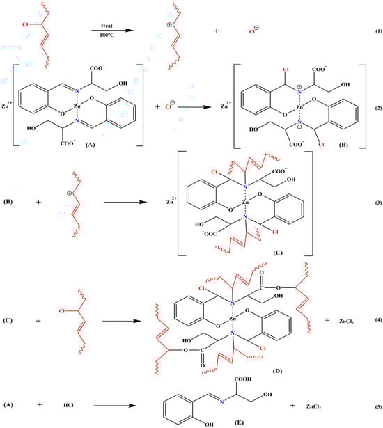 As shown in Figure 9, the heat stability mechanism of ZnL for PVC was derived. Active chlorine was heated and separated from the PVC chain [Equation (1)]. Free chloride ions were then observed to react with imines in ZnL, causing the destruction of the C=N and the formation of a C-Cl bond along with negatively charged nitrogen ions [Equation (2)]. These nitrogen ions were found to bind to previously dissociated PVC chain segments [Equation (3)]. The fatty acid salt-like structures present on ZnL were also capable of replacing active chlorine on the PVC chains [Equation (4)]. Additionally, the carboxylate structure of ZnL was demonstrated to have an absorption effect on HCl [Equation (5)]. In conclusion, ZnL was shown to delay the thermal degradation of PVC at its source by replacing active chlorine and could absorb HCl to prevent further degradation of PVC. ZnL was identified as a promising new heat stabilizer that required further development and refinement [38].