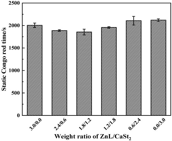 Figure 10 showed the Congo red test results for PVC stabilized by ZnL/CaSt2. As shown in the figure, the static Congo red times of PVC with different ZnL/CaSt2 ratios showed little variation and remained basically at the same level. This result might be due to the following reason: the static stability times of ZnL and CaSt2 were not significantly different when used individually, and no synergistic effect on HCl absorption was observed when ZnL and CaSt2 were used together. Therefore, ZnL and CaSt2 had little impact on the static Congo red time.