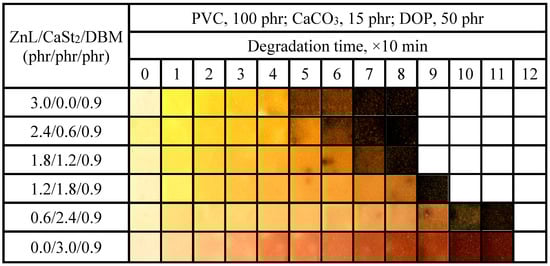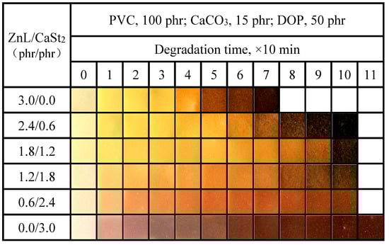 Based on the aforementioned testing experiments of ZnL on PVC, it was observed that PVC stabilized by ZnL exhibited good long-term stability and a certain degree of initial whiteness. However, for its application in the actual production process of PVC, its comprehensive thermal stability effect needed to be further improved [39,40]. To obtain a more efficient thermal stabilizer, the compounding of ZnL was studied in this section. CaSt2, ZnSt2, Pe, DBM, and ESBO were selected to compound with ZnL, and the synergistic thermal stability effects among them were investigated.