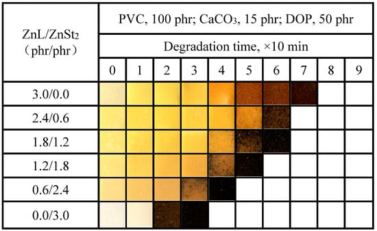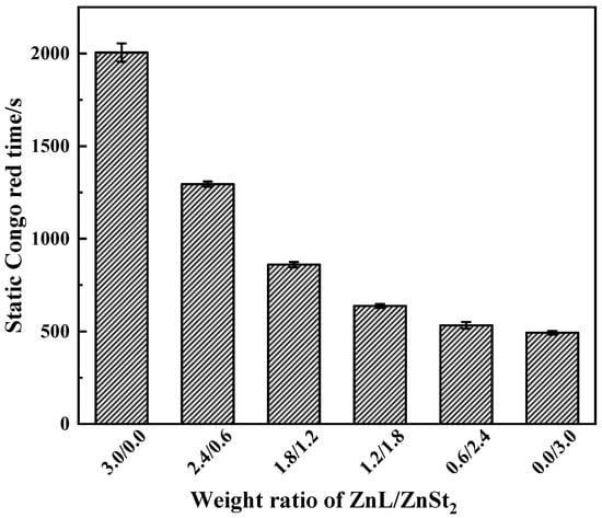 Results of Congo red test on PVC stabilized by ZnL/ZnSt2 were shown in Figure 12. Obviously, due to the poor HCl absorption capacity of ZnSt2 itself, the higher the content of ZnSt2 in the composite heat stabilizer, the worse the Congo red standing time performance of PVC, indicating that the composite thermal stabilizer had a weak ability to absorb HCl, and also reflecting their lack of synergistic effect in HCl absorption.
