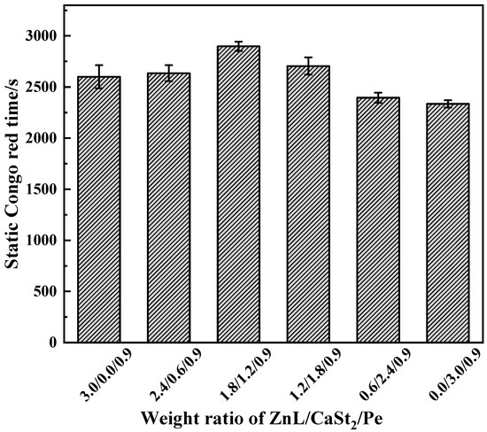 Figure 14 showed the results of the Congo red test on PVC stabilized by ZnL/CaSt2/Pe. Compared with the results of ZnL/CaSt2 in Figure 10, it was found that Pe significantly increased the Congo red time of PVC stabilized by ZnL/CaSt2 at different ratios, indicating that Pe enhanced the ability to absorb HCl of the ZnL/CaSt2 thermal stabilization system. Simultaneously, along with the rise in CaSt2 content, the static Congo red time of PVC stabilized by ZnL/CaSt2/Pe showed a trend of first increasing and then decreasing. The static Congo red time of PVC was optimal when the ratio of ZnL/CaSt2/Pe was 1.8/1.2/0.9, up to 2898 s. This suggested that there was a synergy among ZnL, CaSt2, and Pe, and the combined thermal stabilizer of ZnL, CaSt2, and Pe could better absorb HCl, thus extending the static Congo red time of PVC.