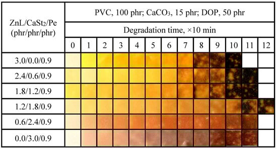 Figure 15 showed the color-changing properties of PVC films stabilized with different ZnL/CaSt2/Pe ratios stable at 180 °C. By comparing the oven discoloration of ZnL/CaSt2 in Figure 11, Pe could enhance the original whiteness and long-term heat resistance of PVC films. The long-term heat resistance of PVC films stabilized by ZnL/CaSt2/Pe was enhanced with the rise of CaSt2 content. When the ZnL/CaSt2/Pe ratio was 1.2/1.8/0.9, the PVC film sample only showed partial darkening of some areas after being heated to 180 °C for 100 min, and it had still not completely blackened after 120 min. At this ratio, PVC exhibited the best overall thermal stability, meaning it had the optimal original whiteness and good long-term heat resistance. These research results indicated that ZnL, CaSt2, and Pe had a synergistic effect on the substitution of active chlorine on PVC and the absorption of HCl gas, thereby effectively strengthening the overall thermal stability of PVC.