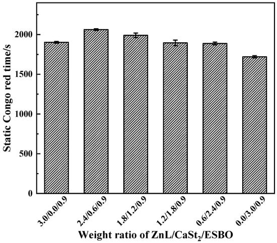 Figure 18 showed the Congo red time of PVC stabilized with ZnL/CaSt2/ESBO. It could be observed that along with the rise of CaSt2 content, the static Congo red time of PVC showed a trend of first increasing and then decreasing. By comparing the static Congo red time of ZnL/CaSt2 in Figure 10, it was found that ESBO could not significantly enhance the static Congo red time of PVC stabilized by ZnL/CaSt2.
