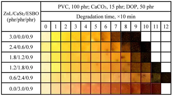The above experiments indicated that the combined effect of ZnL and ZnSt2 was not ideal, and the overall thermal stability actually decreased. When ZnL was combined with CaSt2, both the initial whiteness and long-term heat resistance were improved [41,42]. Therefore, subsequent experiments will adopt a combination of ZnL/CaSt2 with three auxiliary stabilizers (Pe, DBM, ESBO) for joint formulation.