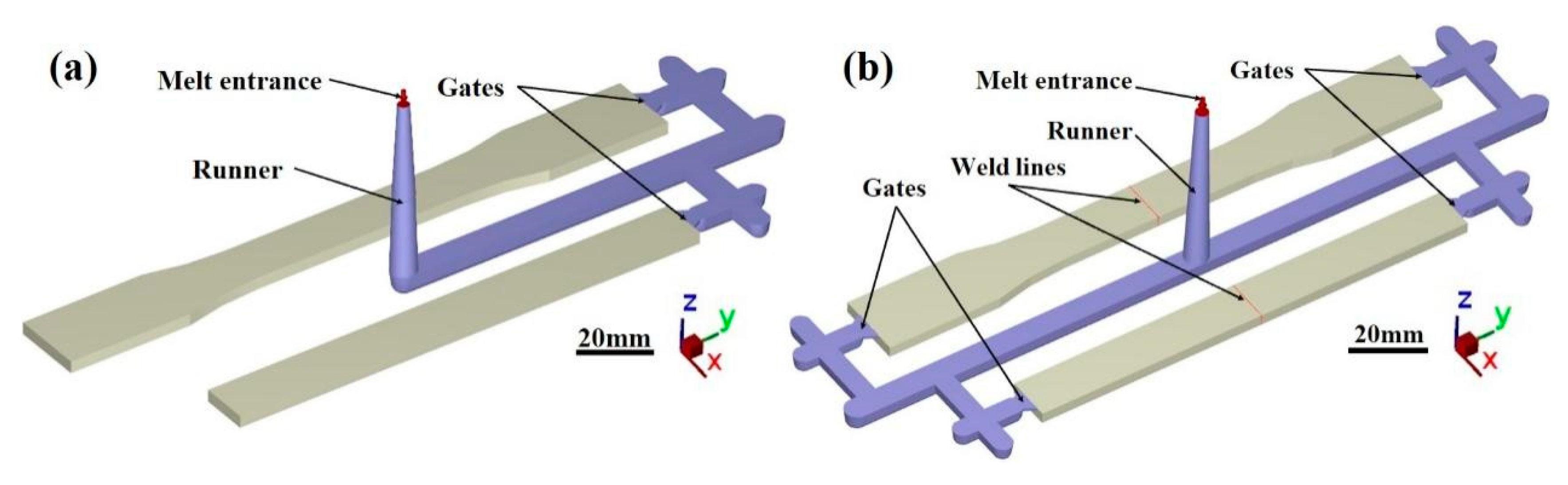 - Li, X.; Zuo, Z.; Mi, H.; Dong, B.; Antwi-Afari, M.; Liu, C.; Shen, C. A Review of Research Progress on the Minimization of Weld Lines in Injection Molding. Int. J. Adv. Manuf. Technol. 2024, 132, 5179–5210. [Google Scholar] [CrossRef]