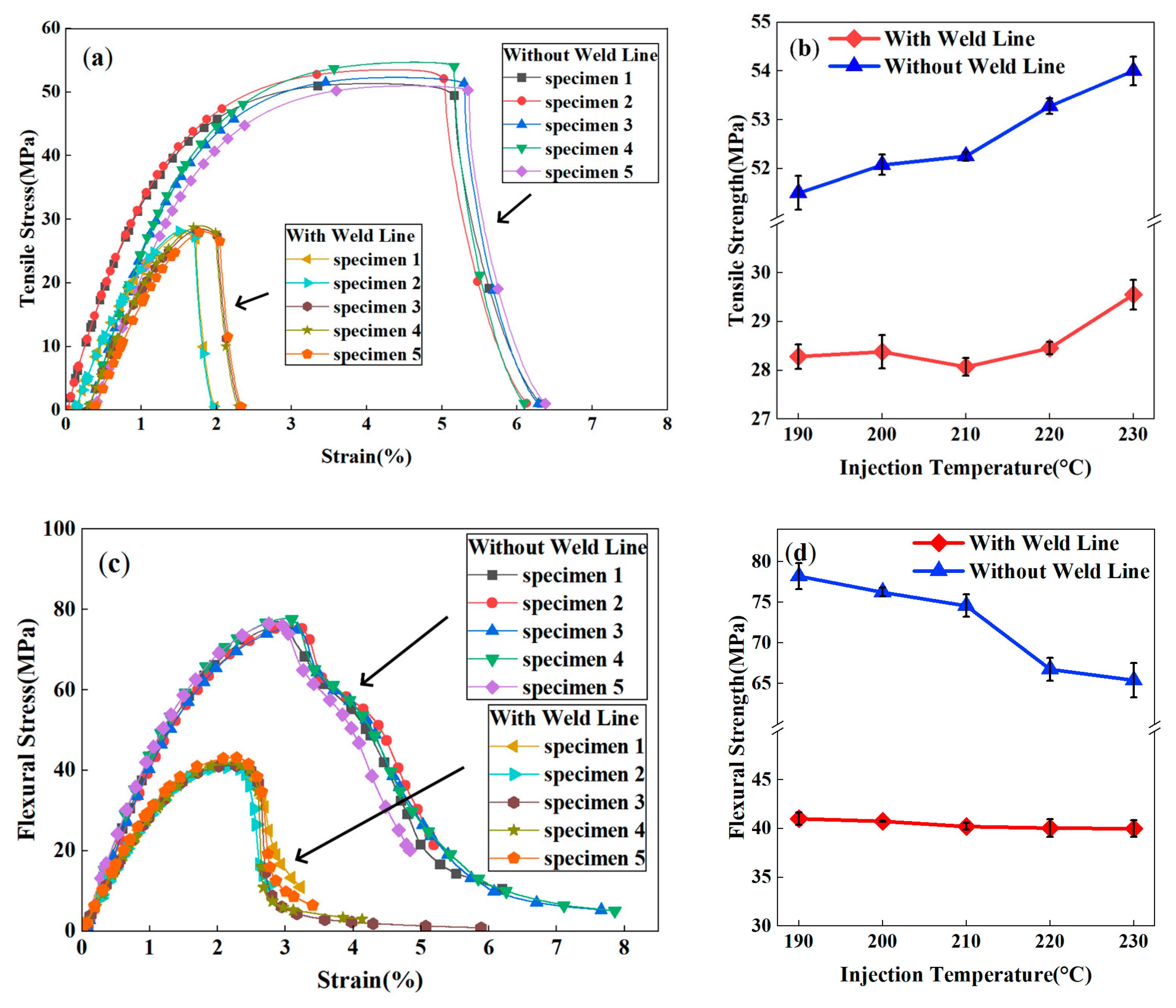 3.1. Influence of Injection Temperature on Mechanical Properties of Weld Lines