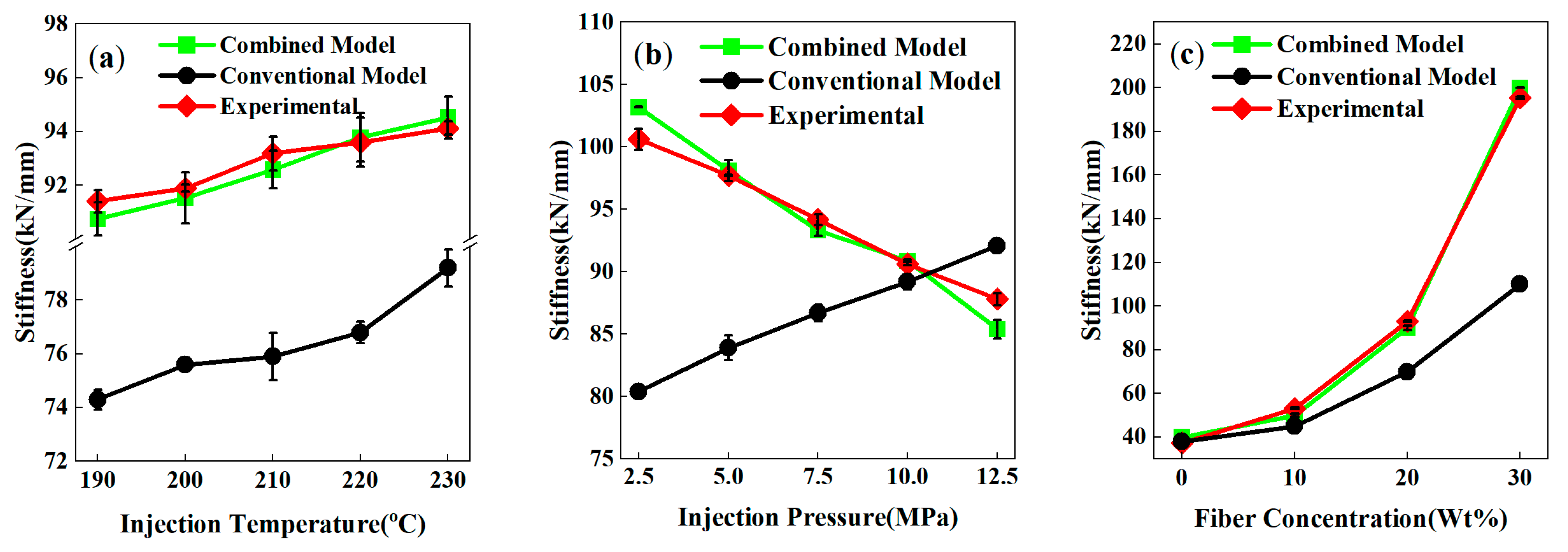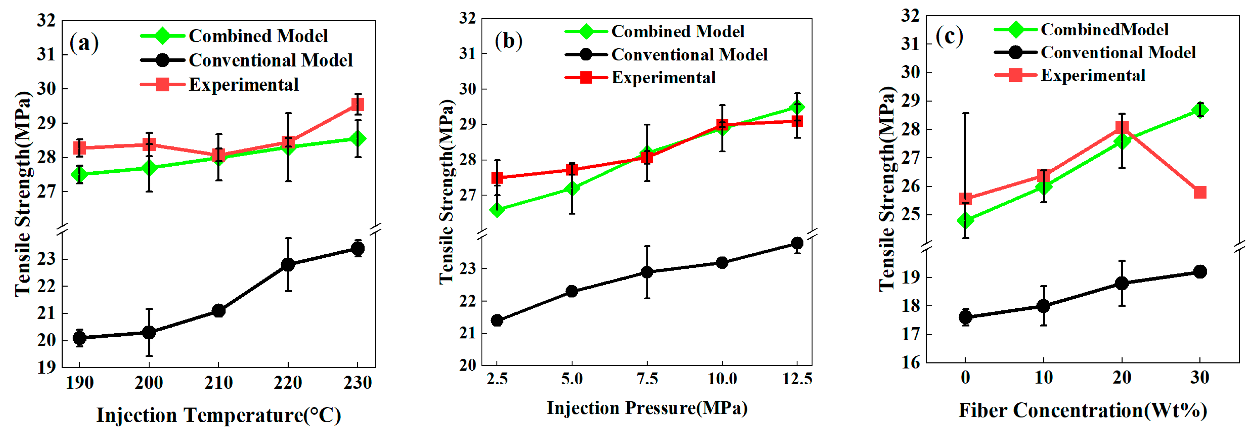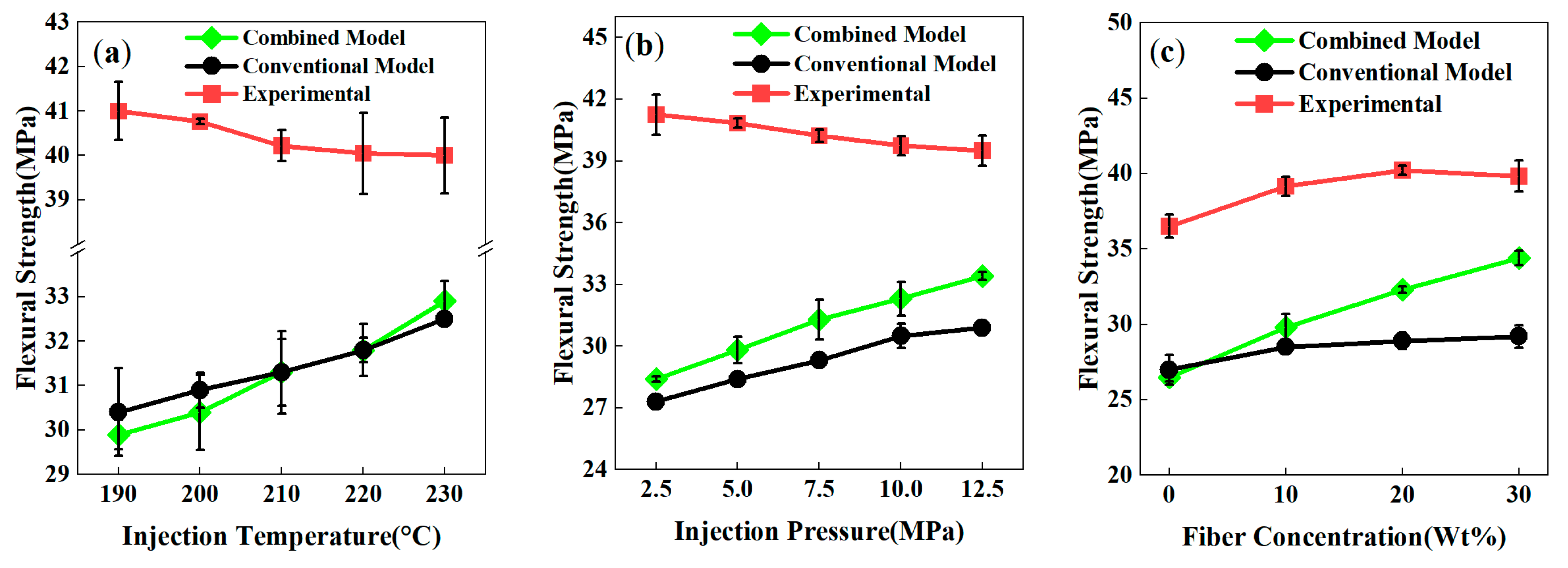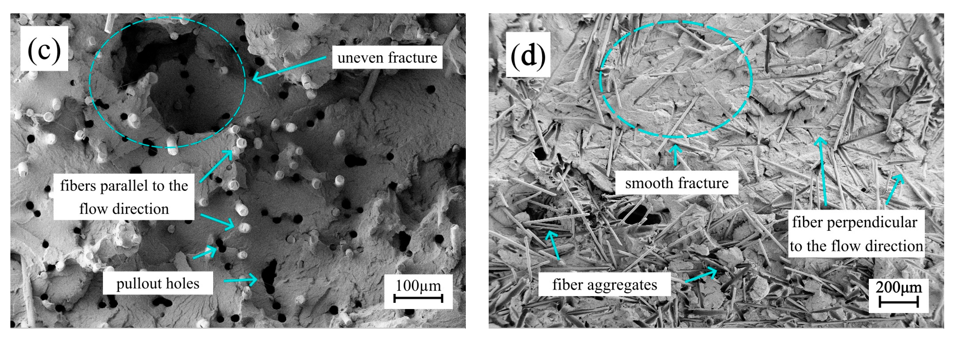 - Injection temperature, injection pressure, and fiber content all affect the mechanical properties of weld lines, with fiber content exerting the most significant influence. When the fiber content exceeds 20wt%, the tensile and flexural strengths of weld lines decrease sharply compared with specimens without weld lines. In the weld line region, the fibers align parallel to the fracture surface and form aggregates, providing a very weak reinforcing effect to the matrix.