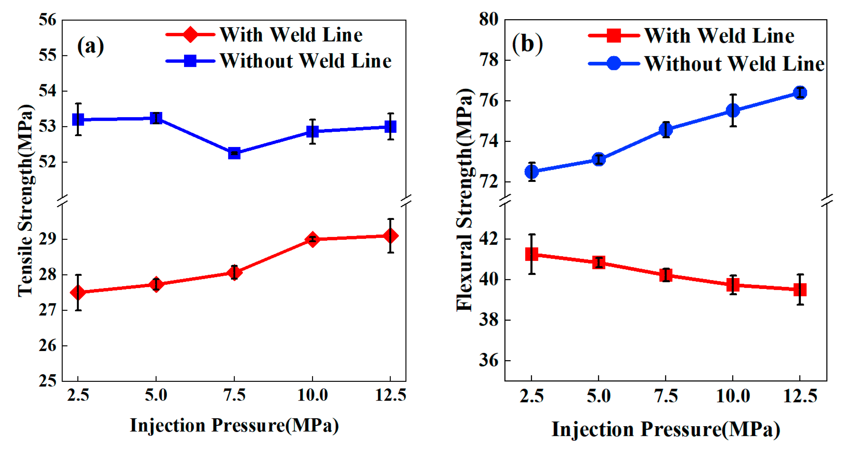 3.2. Influence of Injection Pressure on the Mechanical Properties of Weld Lines