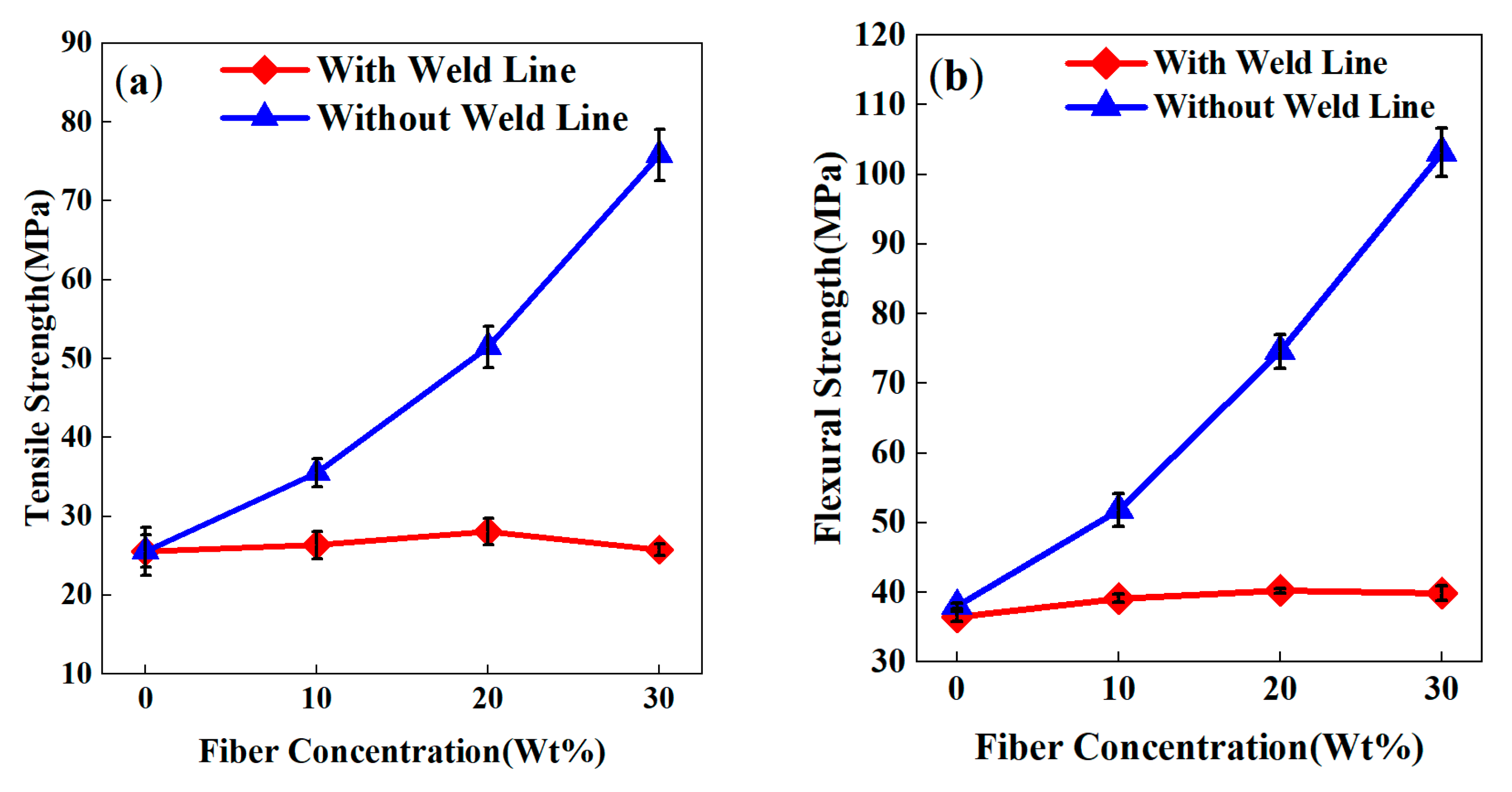 3.3. Effect of Fiber Content on Mechanical Properties of Weld Lines