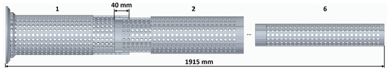 The six-element pneumatic telescopic boom prototype, measuring 1915 mm in length, features a uniform 2D lattice structure optimized to minimize the overall weight, with each element fabricated from the same composite material via additive manufacturing. The structural architecture, detailed in Figure 1, was designed in SolidEdge 2021.