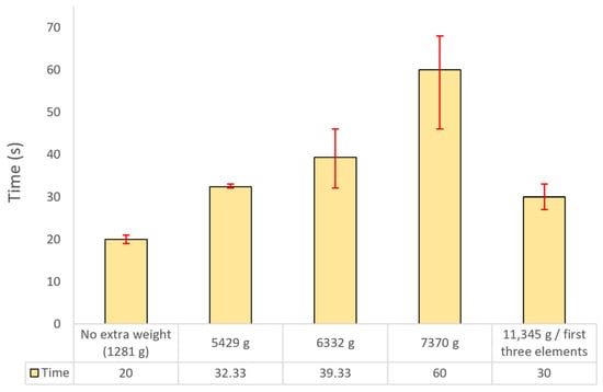 The deployment time results (Figure 4) demonstrate a clear positive correlation between the applied load and the time required for full extension, increasing from 20 s in the unloaded configuration to 60 s under a 7370 g payload. This trend reflects the progressive mechanical resistance experienced by the pneumatic actuation system, primarily governed by friction between the inflatable tube and the inner surfaces of the telescopic elements, as well as inter-element friction amplified by clearance-induced misalignment. Under the maximum applied load of 11,345 g, the deployment time decreased to 30 s, shorter than that observed at 5429 g, due to incomplete deployment. The excessive payload generated binding and static friction forces that exceeded the maximum allowable internal pressure of the pneumatic tube (approximately 2.2 bar), thereby restricting full extension and resulting in reduced angular deflection and shorter operating duration.