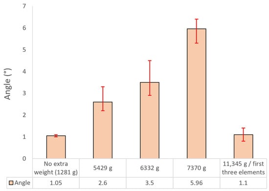 The experimental measurements of angular deflection (Figure 6) indicate a progressive increase in deflection with applied load, reaching a maximum value of 5.96° under a 7370 g payload, compared to a baseline of 1.05° recorded for the unloaded configuration (1281 g). Intermediate load cases of 5429 g and 6332 g resulted in deflections of 2.6° and 3.5°, respectively, thereby confirming the dominant influence of the bending moment on structural deformation within this operating range. Angular deflection was quantified using ImageJ software version 1.54p.