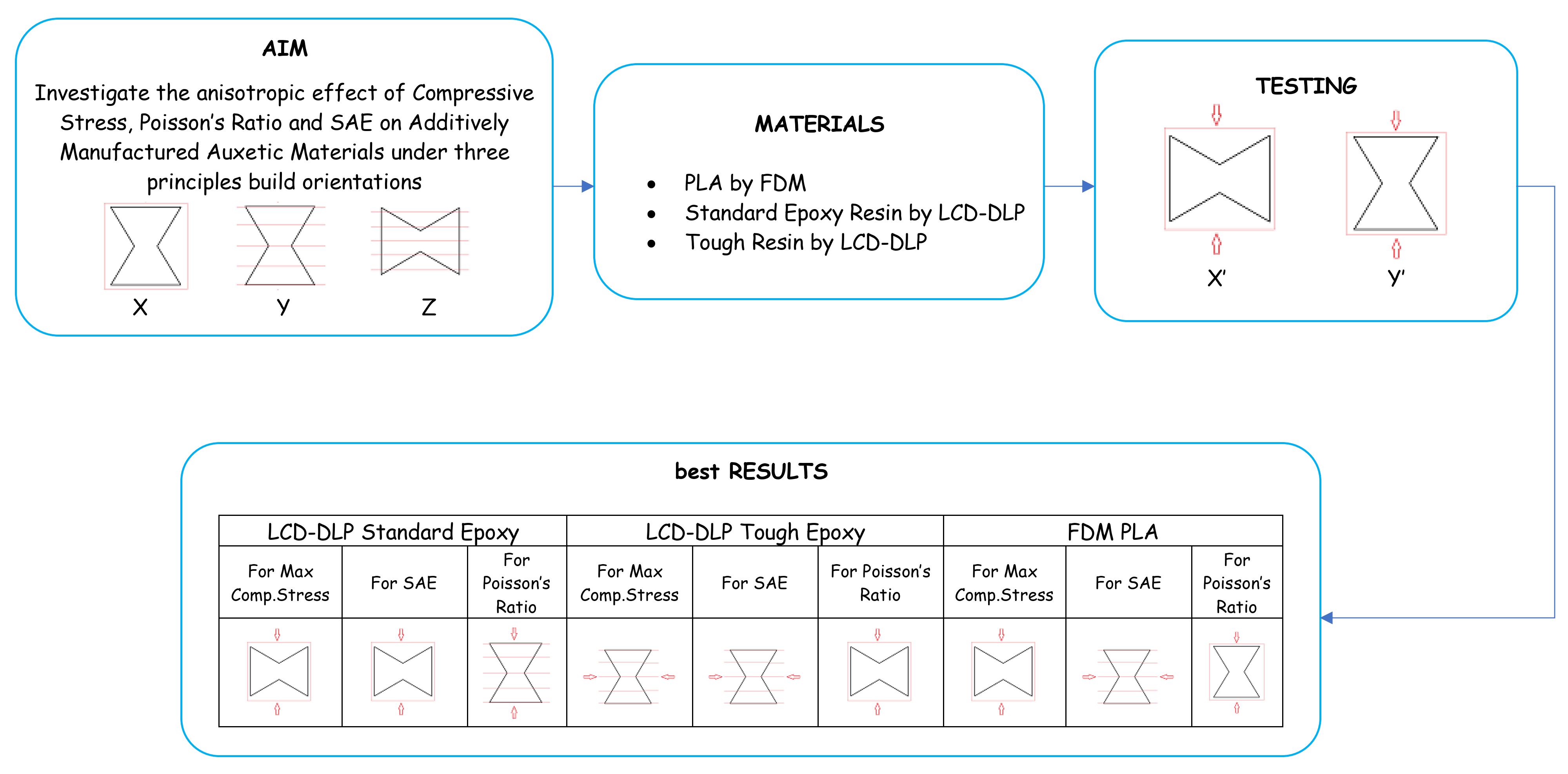 37], there are no comprehensive studies in the literature that systematically compare the combined effects of both build orientation and loading direction on the material performance of auxetic structures fabricated with AM for different AM technologies (especially FDM and DLP/LCD) and polymer types. This gap complicates the selection of the most appropriate fabrication parameters and technology for specific applications.