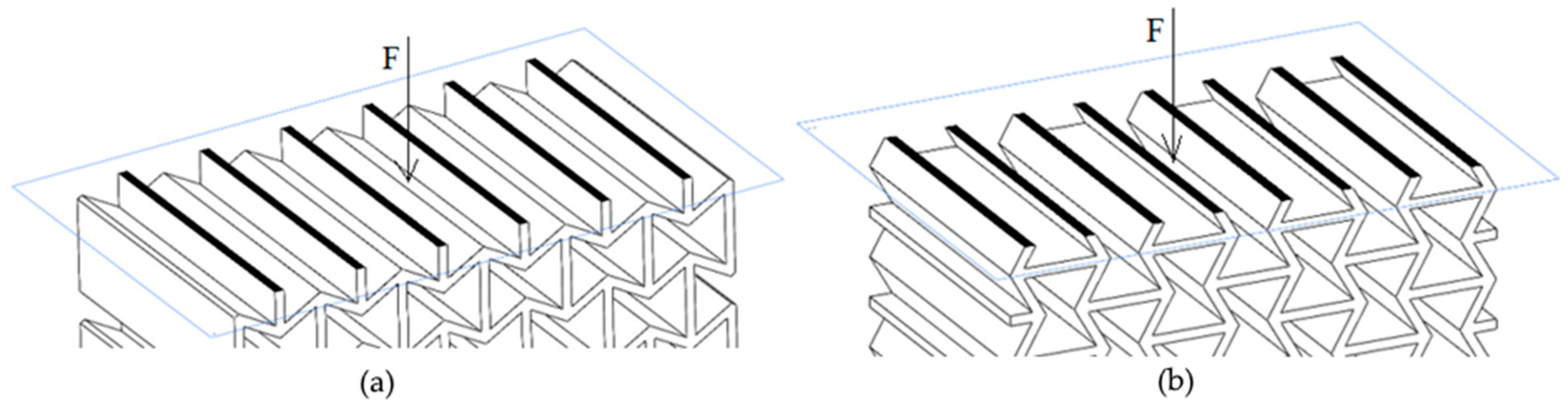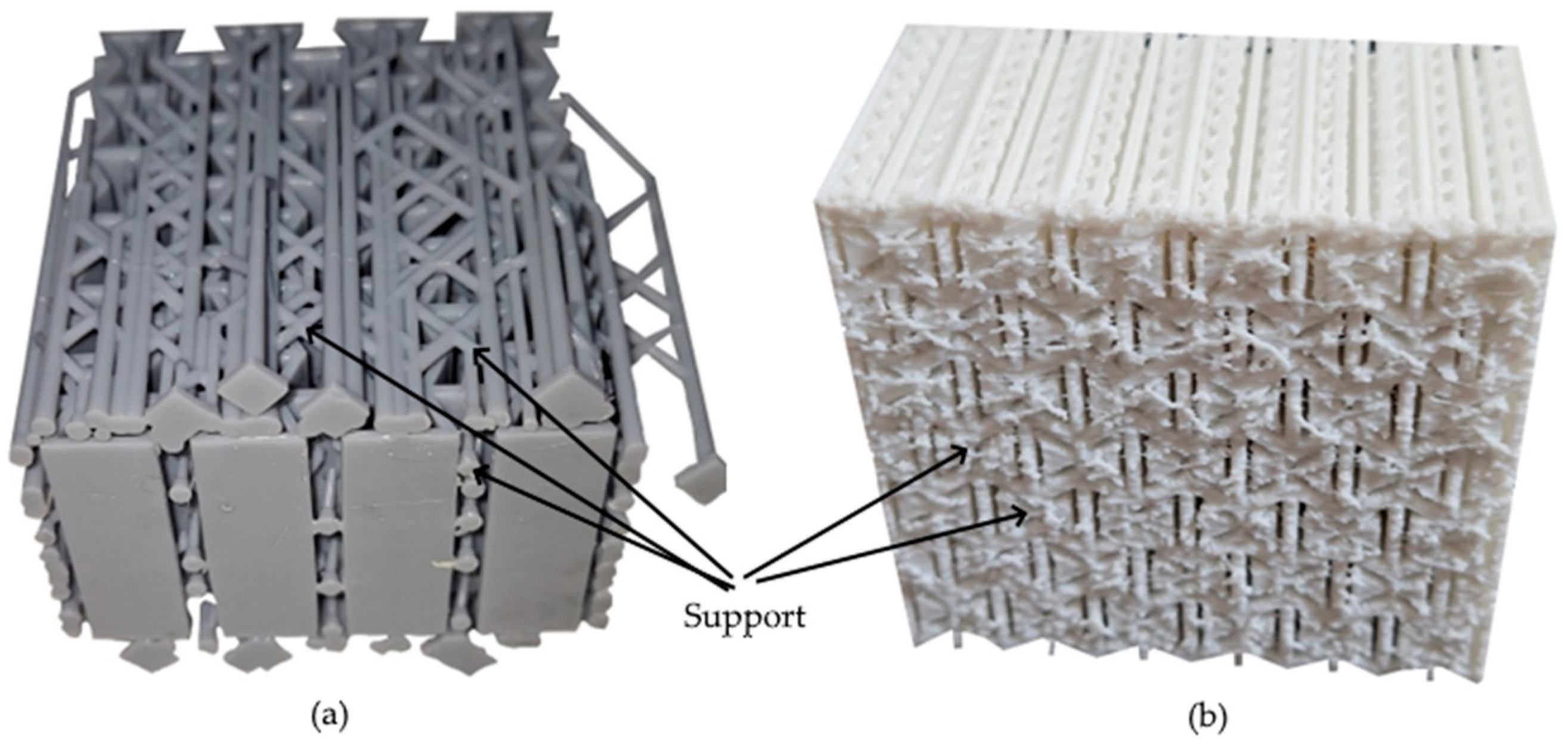 The complex internal cavities of re-entrant honeycomb structures made support removal a labor-intensive and damage-prone step, often introducing surface irregularities that further influenced the mechanical response for both printing methods. Consequently, some studies adopted a Z-axis (upright) printing orientation to eliminate the need for internal supports and ensure a more reliable examination of the auxetic structures [