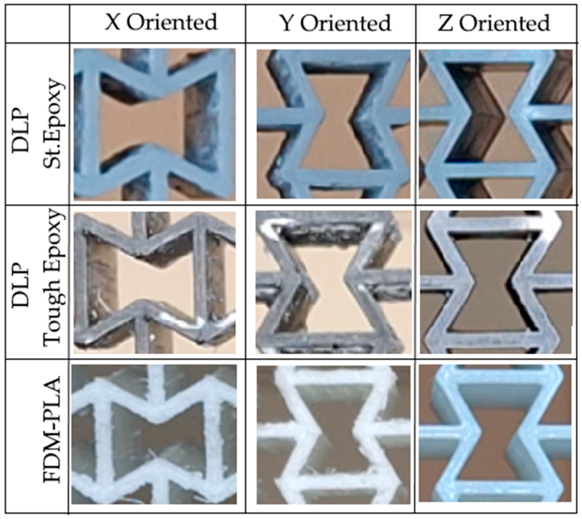 This phenomenon is particularly evident in Fused Deposition Modeling (FDM), where layer adhesion is weak compared to in-plane bonding, resulting in lower strength along the Z-axis. Digital Light Processing (DLP), on the other hand, offers improved interlayer adhesion due to chemical curing, rendering more isotropic behavior when optimal curing conditions are achieved. The layers are chemically bonded and cured in a single step, resulting in stronger interlayer adhesion compared to FDM. Mechanical properties in DLP printed parts are therefore more isotropic than in FDM parts.