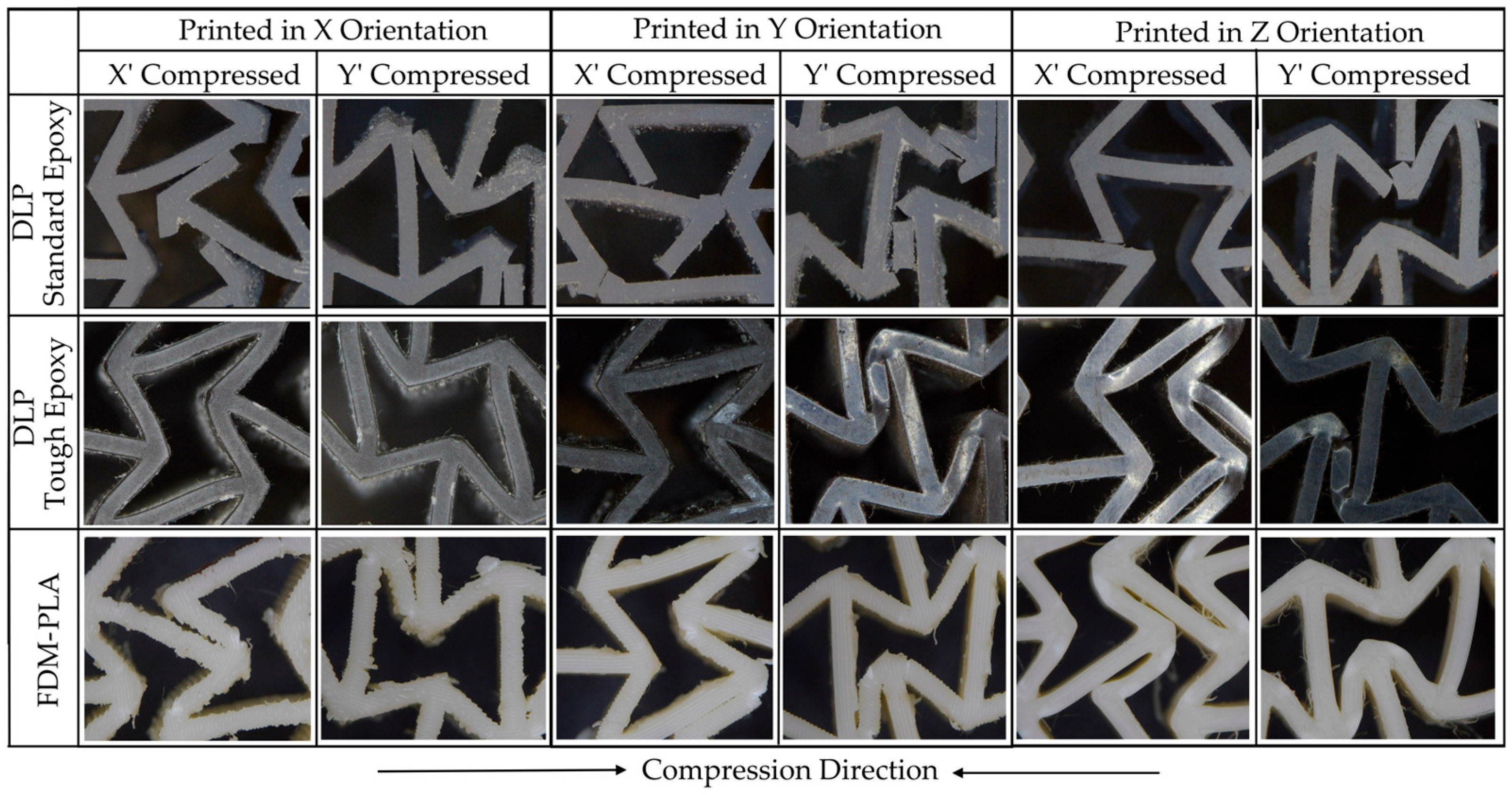 29]. Therefore, build orientation, printing method, and material properties play a crucial role in determining the mechanical behavior of auxetic structures. Changing the printing orientation alters the anisotropic characteristics of the part, which in turn affects the mechanical properties of auxetic materials in a similar way to conventional parts [