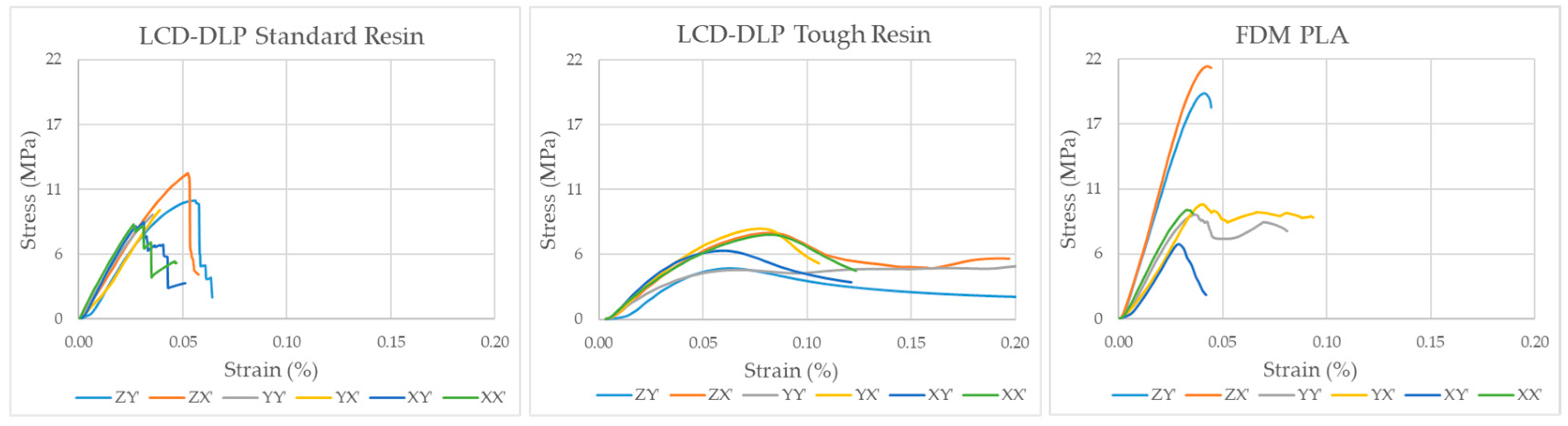 The FDM PLA specimens exhibited the highest peak stress values, reaching up to approximately 20 MPa. However, the stress–strain curves show pronounced fluctuations and abrupt drops, characteristic of layer delamination and anisotropic failure. Specimens printed in the X and Y orientations experienced fracture initiation and propagation along the layer interfaces, resulting in premature failure. Conversely, those printed in the Z orientation did not fracture completely but showed partial delamination, indicating delayed failure due to load alignment with the deposition layers.