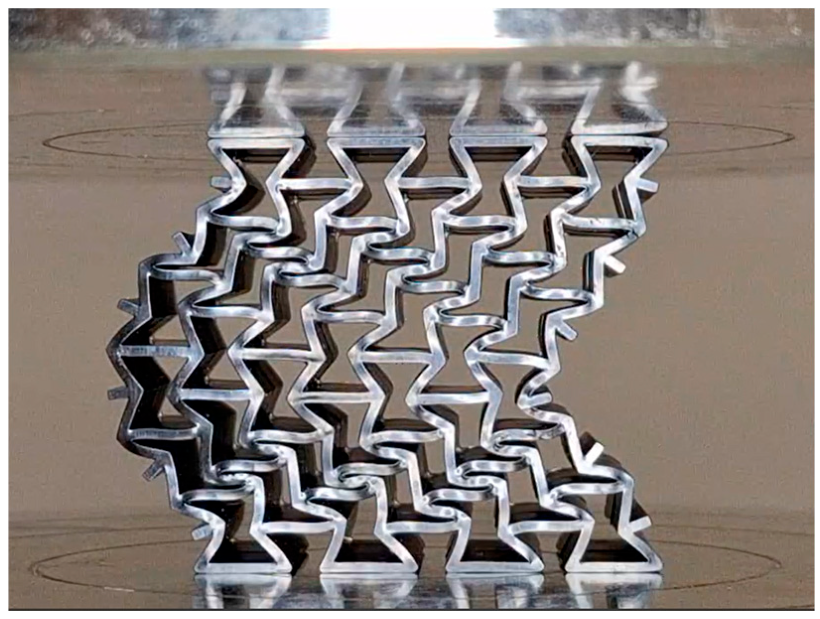 7]. However, current technologies—particularly 3D printers—allow for the easy manufacturing of auxetic materials at various scales and with complex lattice structures. This opportunity, combined with current engineering trends such as the multifunctionality of auxetic structures for shock absorption, as well as for sensors or energy storage, has fueled development. The capability of Additive Manufacturing (AM) to produce such complex geometries with high precision is therefore essential for advancing auxetic applications.