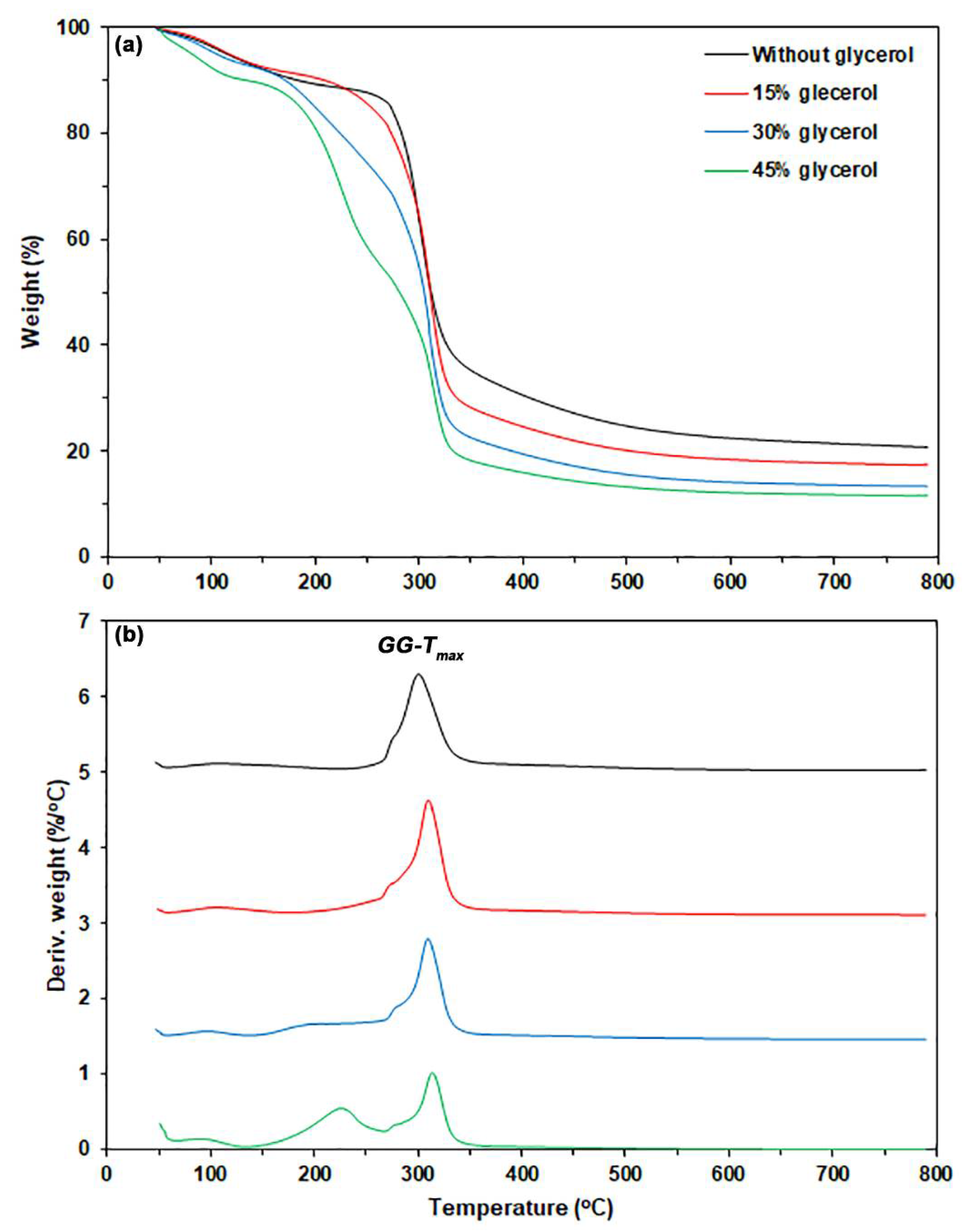 | Sample Code | Glycerol Content (wt%) | Weight Loss of Moisture (50–120 °C) (%) | Char Residue at 800 °C (%) | GG-Tmax (°C) |