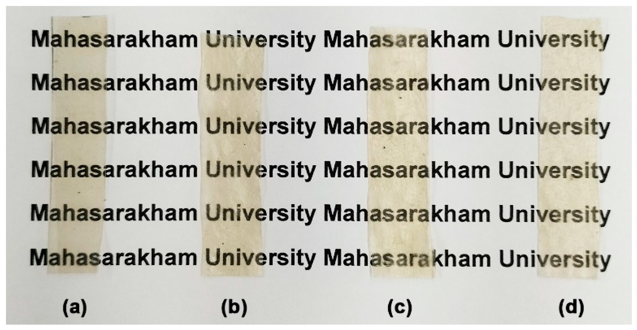 - Sanyang, M.L.; Sapuan, S.M.; Jawaid, M.; Ishak, M.R.; Sahari, J. Effect of plasticizer type and concentration on physical properties of biodegradable films based on sugar palm (Arenga pinnata) starch for food packaging. J. Food Sci. Technol. 2016, 53, 326–336. [Google Scholar] [CrossRef]