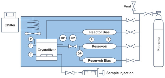 The setup for methane hydrate growth experiments has been described in detail in previous reports investigating gas hydrate growth kinetics [9,28,29,30,31]. The schematic of the setup is illustrated in Figure 2. The experimental conditions were 4646 kPa and 2 °C, which corresponds to a 1500 kPa pressure driving force for methane hydrates. Each test solution, including RO water control, was tested 5 times. The test conditions were selected to be able to make direct comparisons with previous reports using the same experimental setup [9,29,32].