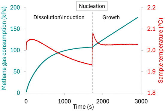 Representative graph of pressure and temperature profiles measured during a methane hydrate growth experiment, marking the dissolution/saturation, nucleation, and hydrate growth events.