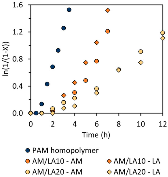 Linearized semi-logarithmic first-order kinetic plot of conversion X versus time for PAM homopolymer and AM/LA copolymers at 70 °C.
