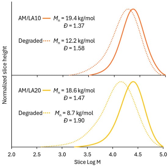 The Tg of PAM measured in this work (155 °C) agrees with reported values (135–170 °C) [50,51]. With increasing LA content, the polymer Tg shifted to lower values, which corresponds to literature observations, as the Tg of poly(LA) homopolymer was estimated to be −11 °C [43]. Due to the very high Tg of PAM, however, nearly all polymer products are extremely brittle at room temperature and were stored in the form of a powder after purification. The exception was the degraded AM/LA20, which exhibited a more malleable, plastic appearance. Its Tg fell from 81 °C to 3 °C after degradation due to its much lower molecular weight.