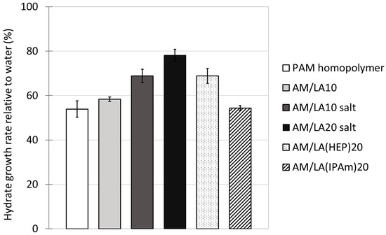 Using LA as a degradable comonomer therefore allows the production of highly water-soluble degradable copolymers. However, other challenges arise for the objective of applying these copolymers as hydrate inhibitors. The structure I methane hydrate growth rates with the addition of various KHIs at 700 ppm in RO water are tabulated in Figure 9. The effects of PAM and AM/LA10 reduced methane consumption in the crystallizer to 54% and 58% of that of the water control runs, respectively. The presence of LA within the statistical copolymer slightly reduced the inhibition performance at the cost of making the KHI degradable. Dividing the amide groups, which are crucial for hydrate inhibition, by inserting comonomers was unfavorable for the intended application. In their recent article, Kelland’s group attempted to use several polyesters as degradable polymeric KHIs, which also resulted in mild inhibitory effects [57]. It was suspected that the desire to introduce weaker linkages into the polymer backbone reduced the density of the crucial pendant-groups, typically amides. That hypothesis would also apply to this current study. The ring-opening polymerization of LA created more chain mobility, as characterized by DSC, which indicated lower Tgs for the copolymers. As a result, this might create a looser barrier on the hydrate surface, or offer less steric hindrance during hydrate growth inhibition, as the gaps between side-chains are wider due to the insertion of disulfide bonds.