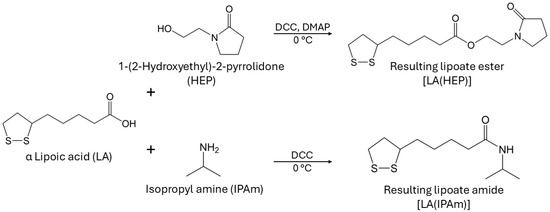 Coupling of lipoic acid with desirable functionalities for a KHI into LA(HEP) and LA(IPAm).