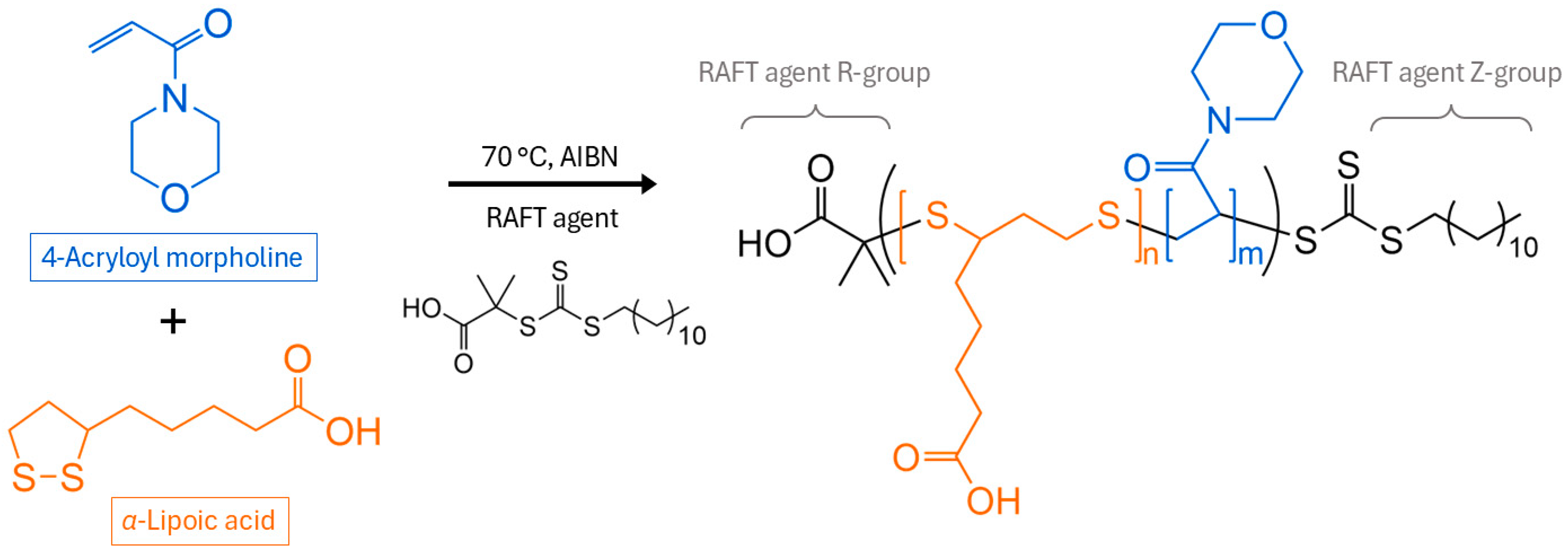 Hereby presented is the list of chemicals used in this project with their abbreviations, purities, and suppliers: 4-Acryloyl morpholine (AM, 97%, Sigma-Aldrich, St. Louis, MO, USA), DL-α-lipoic acid (LA, >99.0%, TCI America, Portland, OR, USA), 2-(Dodecylthiocarbonothioylthio)-2-methylpropionic acid (RAFT agent, high-performance liquid chromatography (HPLC) grade, 98%, Sigma-Aldrich), Azobisisobutylnitrile (AIBN, recrystallized), Acetonitrile (MeCN, Certified ACS, Fisher Chemical, Waltham, MA, USA), N,N-Dimethylformamide (DMF, HPLC grade, ≥99.9%, Sigma-Aldrich), Diethyl ether (≥99.9%, Sigma-Aldrich), Tetrahydrofuran (THF, HPLC grade, ≥99.9%, Sigma-Aldrich), Heptane (HPLC grade, Fisher Chemical), Tris(2-carboxyethyl)phosphine hydrochloride (TCEP, Sigma-Aldrich), Chloroform (anhydrous, ≥99%, stabilized with amylenes, Sigma-Aldrich), Sodium hydroxide (NaOH, pellets, Certified ACS, Fisher Chemical), Reverse osmosis water (RO water, with resistivity of 1.2 MΩ), Nitrogen (Smart Top, ALPHAGAZTM, Air Liquide Canada, Montreal, QC, Canada), Methane (ultra high purity grade, 99.97%, Linde Canada, Inc., Montreal, QC, Canada).