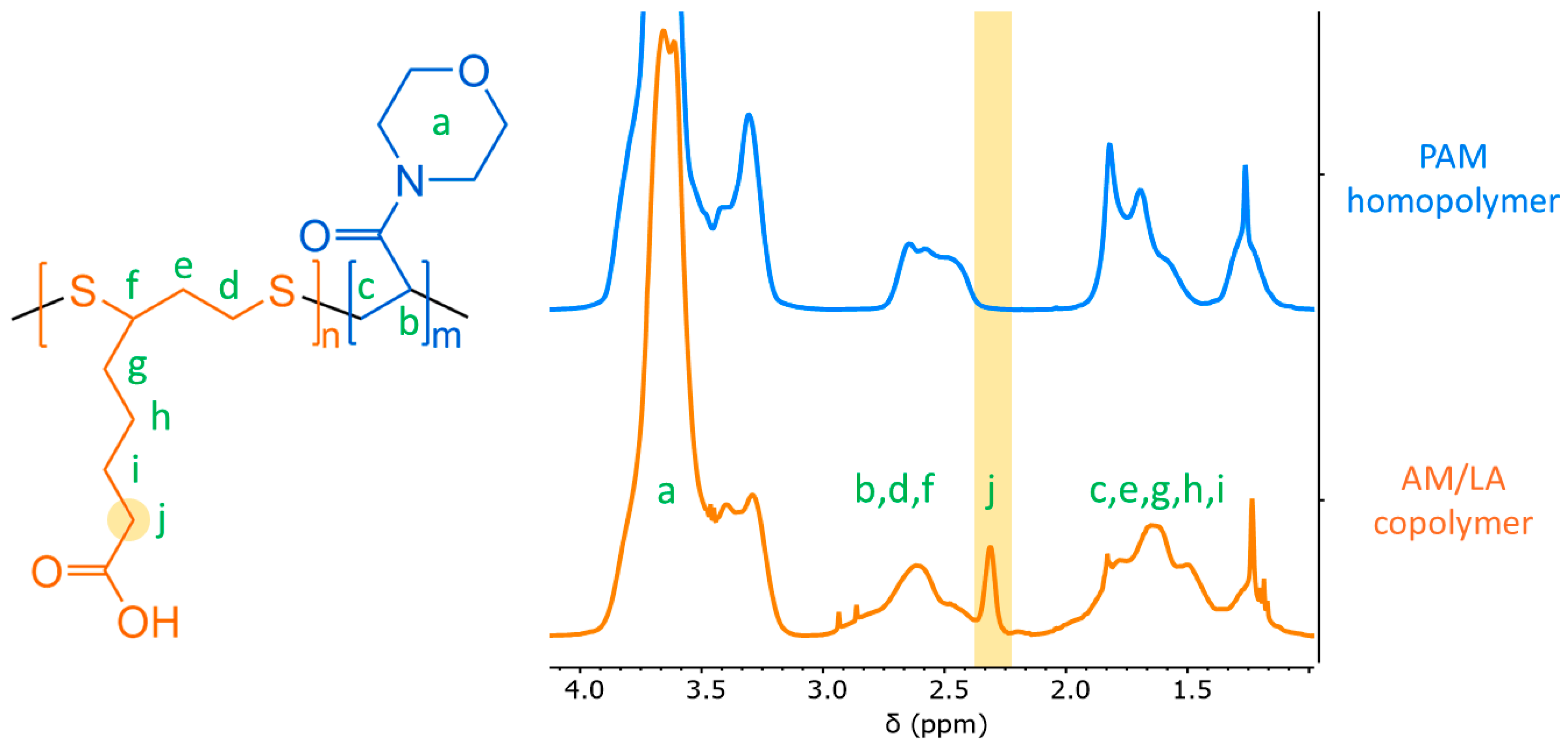 1H NMR spectra of PAM homopolymer and AM/LA10 copolymer in CDCl3 (500 MHz). The lowercase letters attribute each proton to their corresponding peak within the spectra. The characteristic peak for the LA repeat-units within the copolymer, used to determine the final copolymer composition FLA, has been highlighted.