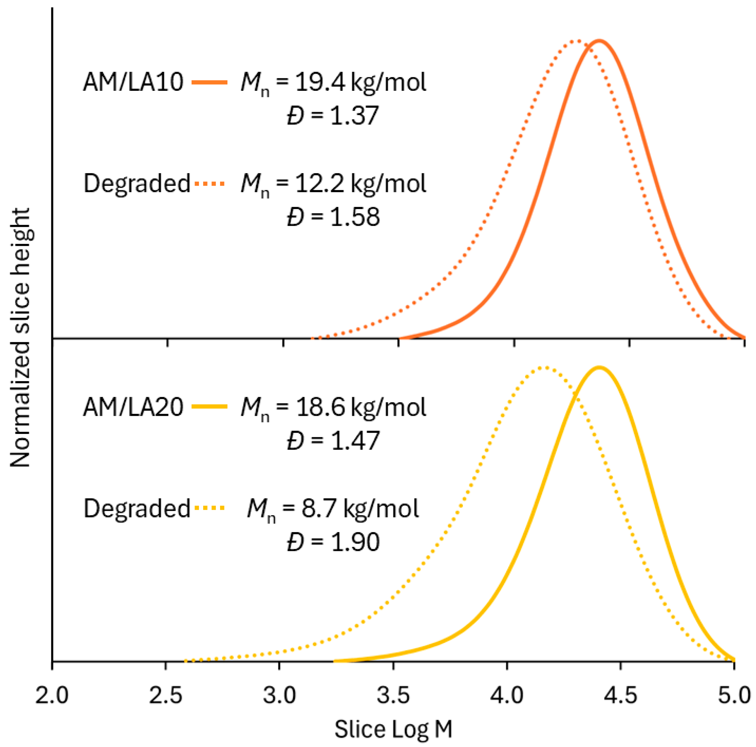Mn of degraded AM/LA copolymers at 10% and 20% LA feed (12 kg/mol and 9 kg/mol, respectively) are comparable to those shown in the first report by Albanese et al. in 2023 [
