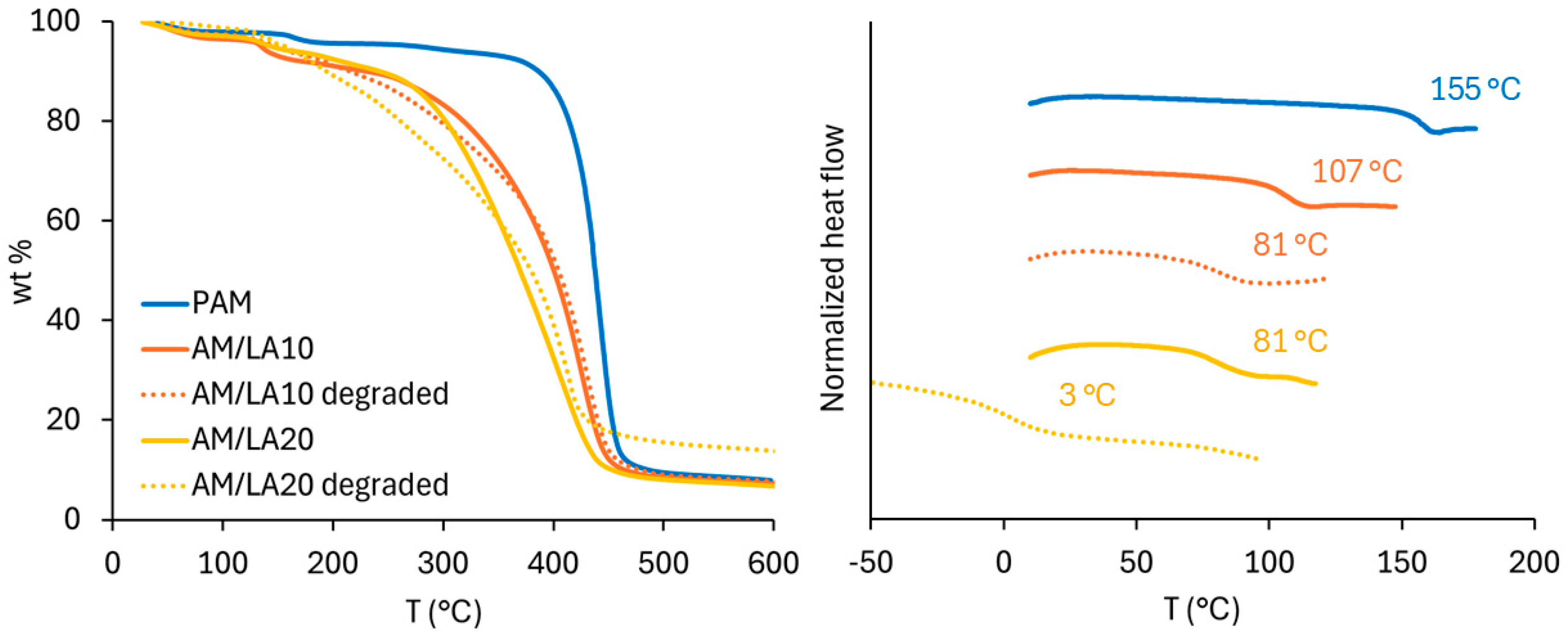 Tg of PAM, however, nearly all polymer products are extremely brittle at room temperature and were stored in the form of a powder after purification. The exception was the degraded AM/LA20, which exhibited a more malleable, plastic appearance. Its