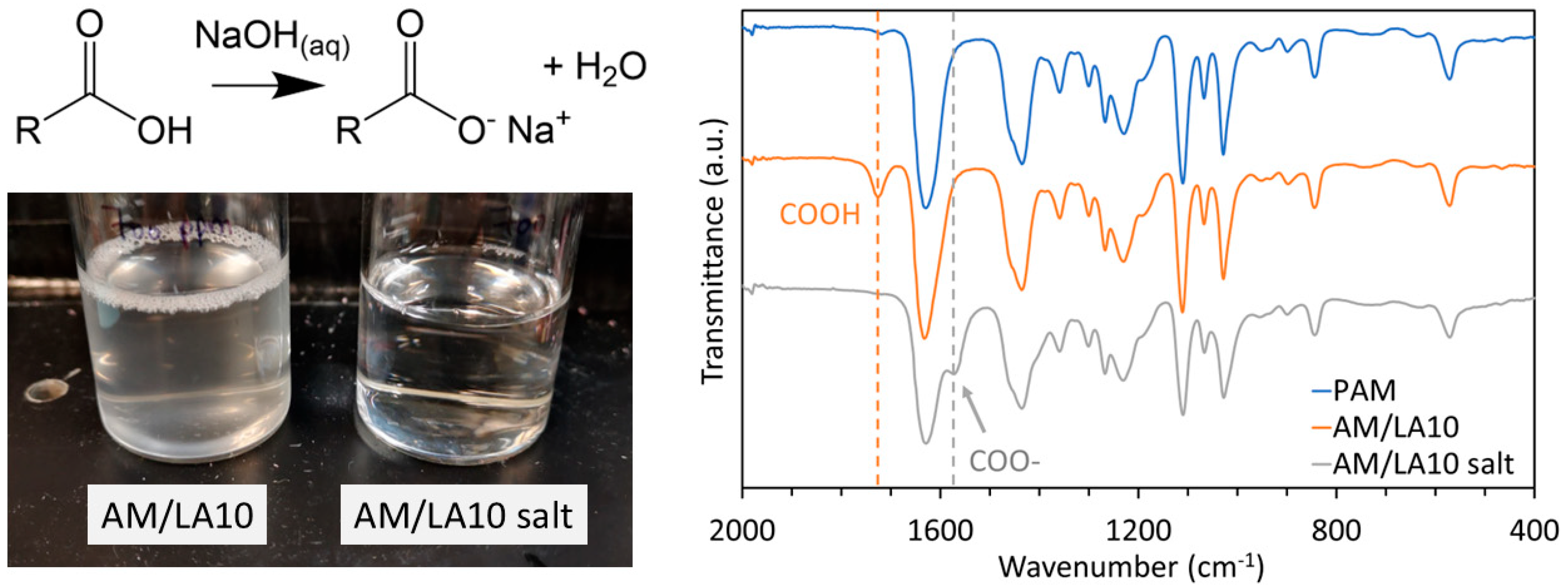 53]. In this manuscript, deprotonation of the carboxylic acid units using NaOH to form a sodium carboxylate salt was tested as a means to improve their water solubility. The comparison between the translucent AM/LA10 suspension before treatment and the clear solution after ionization is demonstrated in