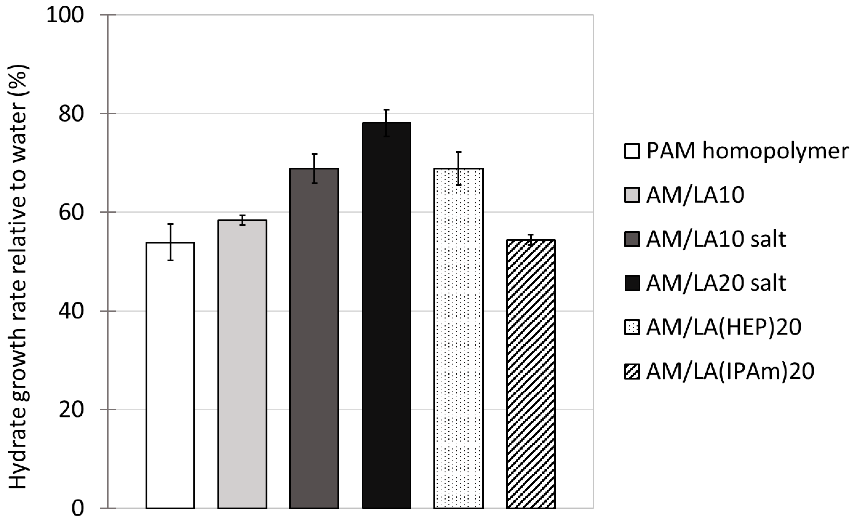 Using LA as a degradable comonomer therefore allows the production of highly water-soluble degradable copolymers. However, other challenges arise for the objective of applying these copolymers as hydrate inhibitors. The structure I methane hydrate growth rates with the addition of various KHIs at 700 ppm in RO water are tabulated in