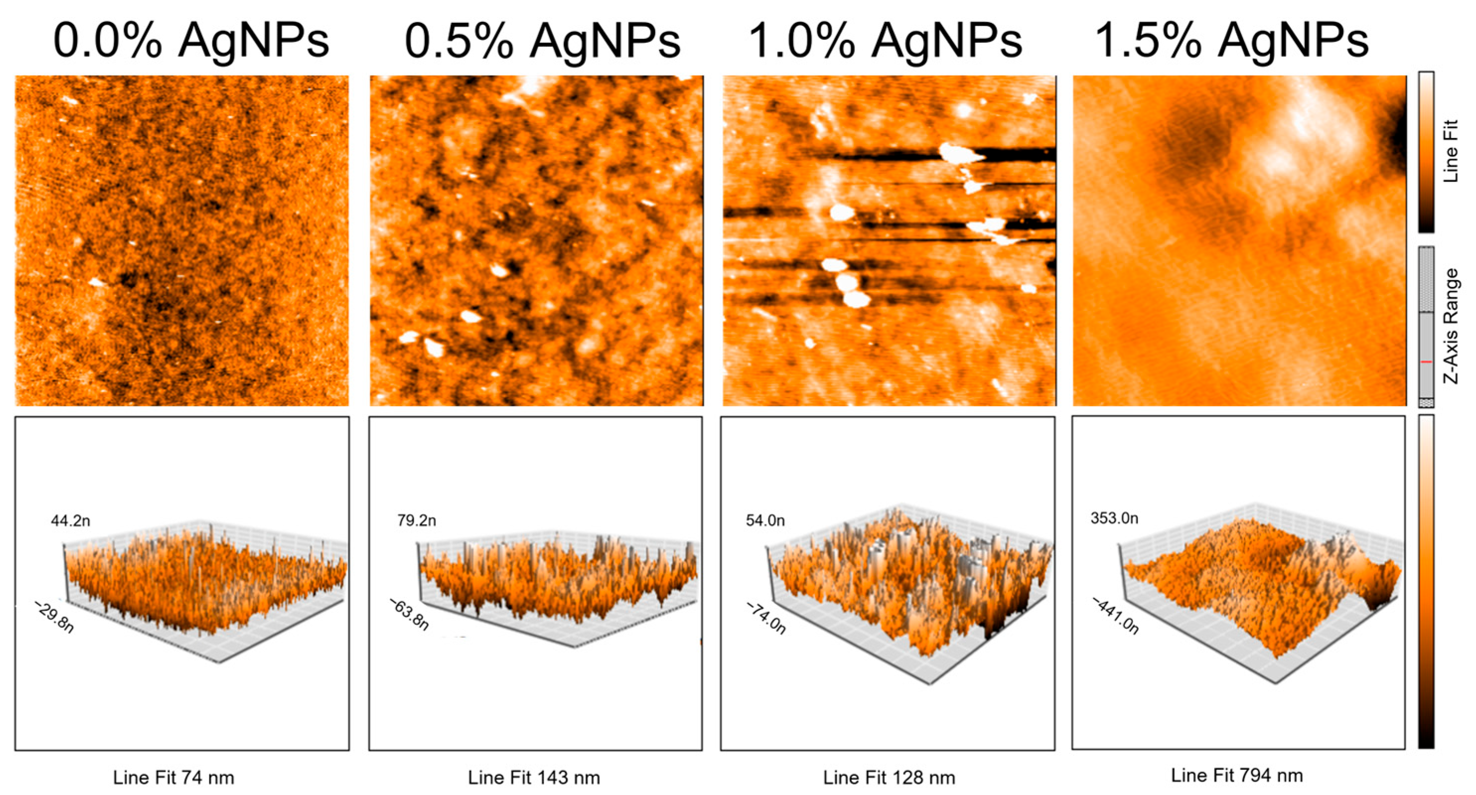 | AgNP Concentration (%) | Roughness Ra (nm) | Roughness Rq (nm) |