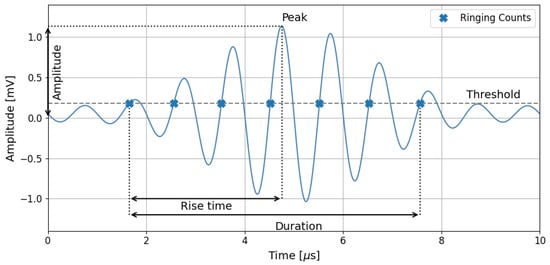 - Rise Angle RA—defined as the ratio of rise time and peak amplitude. Amplitude was reduced by a threshold value specific to each measurement and the background noise characteristic for the measurement environment [].