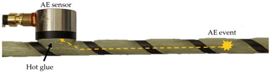 Acoustic wave path from the damage location to the piezoelectric sensor. In the investigated case, the AE signal has to travel through different materials such as matrix, reinforcement, hot glue and sensor material.