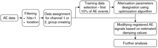 Reduced data, which fulfills location and hits limitations, are taken into investigation. Loading conditions in the material can change the attenuation properties due to crack development or fiber breakage, so the first 10% of reduced data were taken for the optimization procedure. Training data were grouped into sets of data based on whether they were registered by channel 1 or channel 2. To characterize the attenuation output of applied parameters for each iteration, the score was calculated using Equations (11) and (12). Designated attenuation parameters were used to modify the whole AE data for further analysis. The algorithm is presented in Figure 8. The reproducibility of the algorithm outcome was verified by running the optimization procedure 10 times. If the coefficient of variation were under 2% for the achieved results, the mean value was qualified as the correct solution.