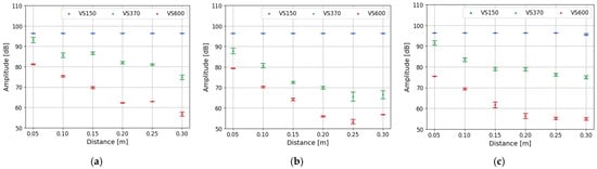 Dependency of the registered amplitude on the distance between piezoelectric sensors during pulsing procedure for (a) glass fiber rebars, (b) hybrid rebars, (c) carbon fiber rebars.
