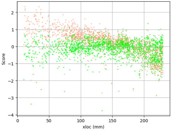 The training dataset was used in the simulation to achieve the best results of attenuation. The outcome from one of the simulations is provided in Figure 11 presenting the value of the individual score over the location of AE event. The attenuated values of amplitude and energy were plotted over the transparent original data to better compare the outcome. The obtained results are not characterized by perfect matching of the attenuated signals; some scatter of the data can be noticed. There can be multiple reasons for such phenomena, such as the acoustic emission signal consisting of a spectrum of various frequencies or anisotropy of attenuation parameters in composite material—different coefficients along and perpendicular to the fibers. The spectrum of frequency of one of the registered acoustic waves, after Fast Fourier Transform, in the time domain is shown in Figure 12. The coefficients established from training data were used in the correction of the whole set of AE signals. One of the corrected databases is presented in Figure 13. Attenuation impact is visible on the cited data. Used correction helps with eliminating the mounting influence or localization on the results.