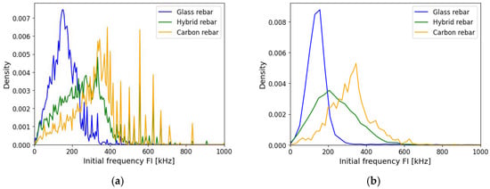 Frequency is one of the elementary parameters used for acoustic wave description. In general, the FFT analysis is conducted to obtain the variables, such as the frequency center of gravity or the maximum amplitude of the frequency spectrum. In the following work, the other frequency parameters obtained from the analysis of the raw acoustic signal registered by the AE system are described. The initial frequency FI is obtained as the number of counts registered in the period of time to the peak value. The parameter can be affected by the threshold value set as an acquisition setup at the beginning of the test, determining the moment of counts and time registration. The impact of the proposed attenuation method, described with Equation (13), is shown in Figure 14. The application of various reinforcement materials has a significant impact on the initial frequency distribution registered by the AE system. The values of frequency characterized by glass and carbon fibers present a slight overlap in the 200 kHz frequency, but most of the events were divided. The attenuation method improves the outcome from the measurements, reducing the number of events that present the same range of frequency values. The hybrid rebar represents mixing of the values characteristic for two types of reinforcement, which suggests that damage mechanisms occur in both reinforcement materials.